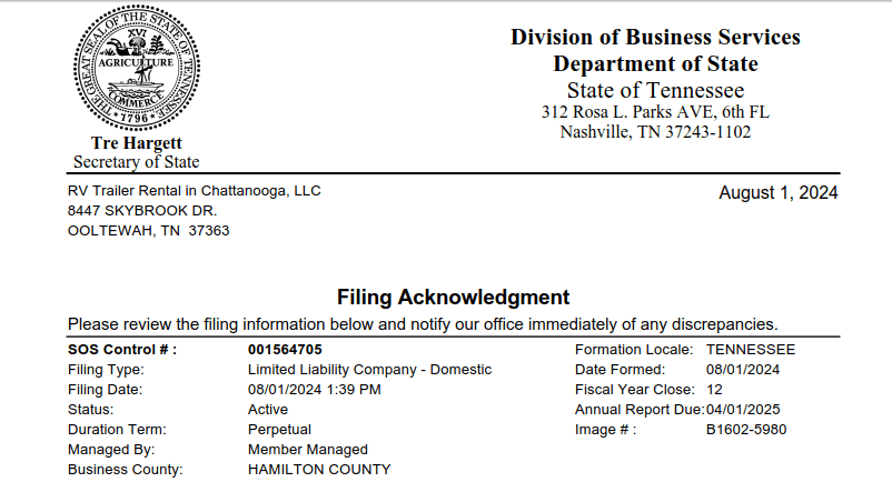 We have officially opened a business: RV Trailer Rental in Chattanooga, LLC.